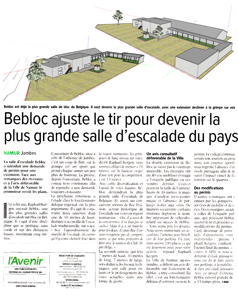 nouvelle demande de permis pour une extension qui en fera la plus grande salle d'escalade de Belgique. Le journal L'Avenir en parle dans son édition du 12 janvier 2026.